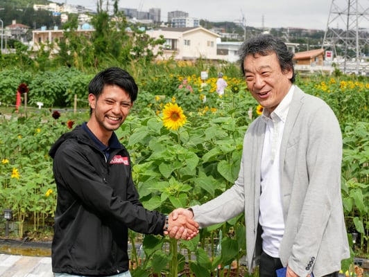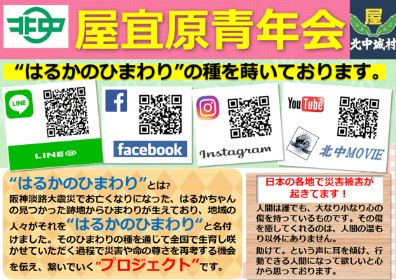 2月には日本で一番早い「ひまわり祭り」を標榜する沖縄県北中城村を訪問し交流しました。同祭りは、今年度から生育区画を市民団体や企業などへ割当て、村を上げて行う祭りへとなり、エイサーの文化継承を行う”屋宜原青年会”の皆さんが応募され、はるかのひまわりを咲かせてくださいました。