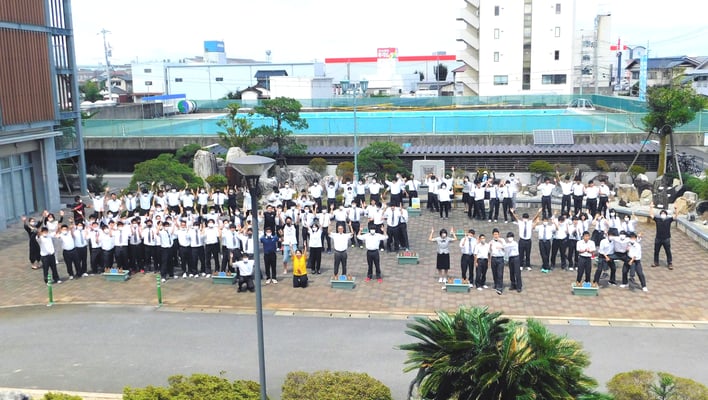 今年は、各クラス1鉢に増やし《コロナからの再生!地域の皆さんを元気を届けよう!》と各クラスの室長、運動部部活顧問の先生方の呼びかけで集まってくれた生徒・先生・保護者は150人あまり。保護者から命の種1粒を大きな両手を出して受け取る生徒達に皆が感動しました。各クラスで種まきが終わり、2階から撮影した写真のポーズは、はるかのH🌻